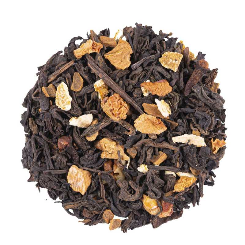 Té rojo pu-erh, canela, cardamomo, clavo, jengibre, pimienta, cáscara de limón y aroma natural.